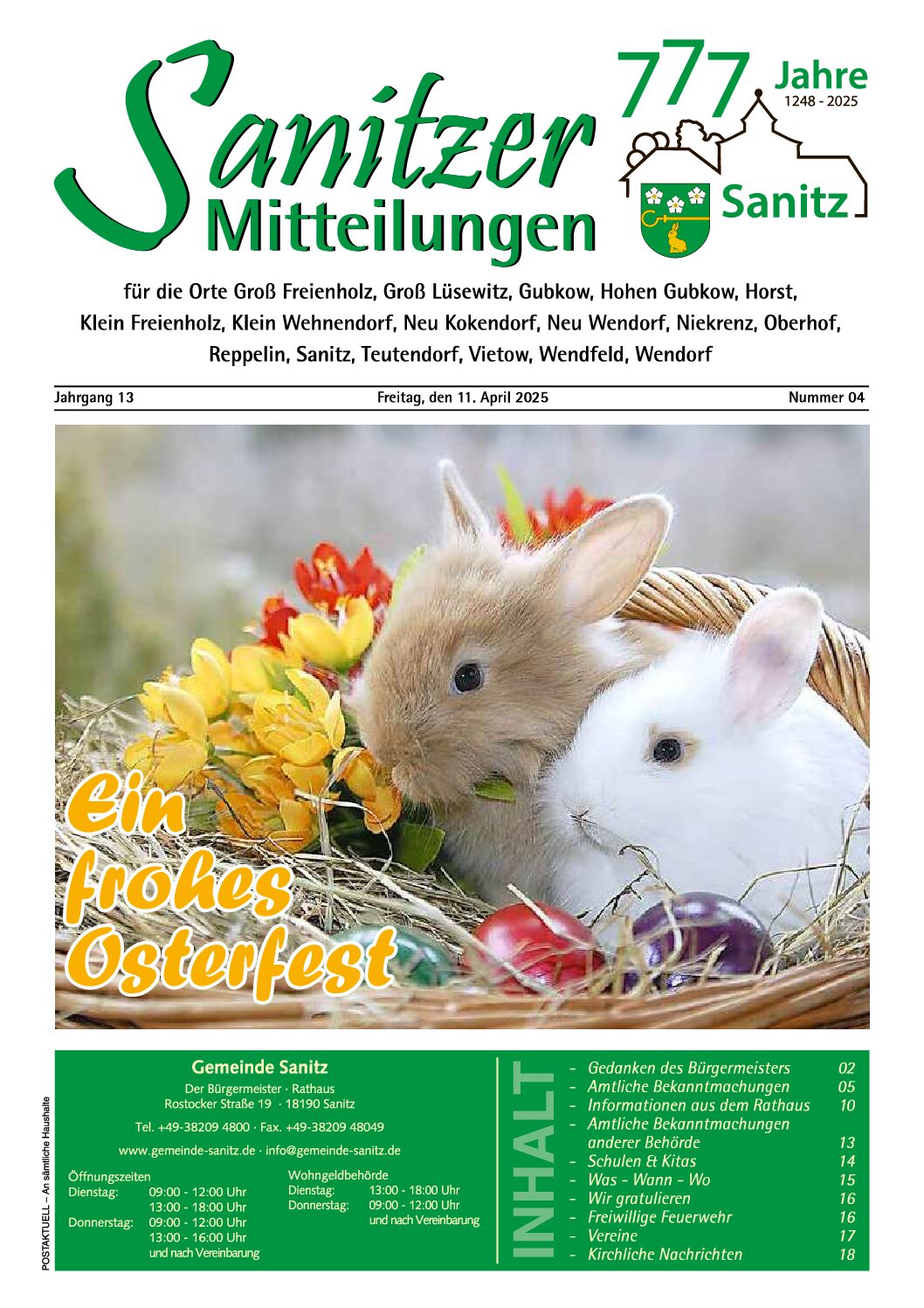 BEKANNTMACHUNGS-BLATT Nichts mehr verpassen! Auf dieser Seite finden Sie das Bekanntmachungsblatt der Gemeinde Sanitz. Aktuelle Sanitzer Mitteilungen Monat Dezember Sanitzer Mitteilungen 2025 Mitteilungen Monat Dezember Mitteilungen Monat November Mitteilungen Monat Oktober Mitteilungen Monat September Mitteilungen Monat August Mitteilungen Monat Juli Mitteilungen Monat Juni Mitteilungen Monat Mai Mitteilungen Monat April Mitteilungen Monat März Mitteilungen Monat Februar Mitteilungen Monat Januar Sanitzer Mitteilungen 2024 Mitteilungen Monat Dezember Mitteilungen Monat November Mitteilungen Monat Oktober Mitteilungen Monat September Mitteilungen Monat August Mitteilungen Monat Juli Mitteilungen Monat Juni Mitteilungen Monat Mai Mitteilungen Monat April Mitteilungen Monat März Mitteilungen Monat Februar Mitteilungen Monat Januar Sanitzer Mitteilungen 2023 Mitteilungen Monat Dezember Mitteilungen Monat November Mitteilungen Monat Oktober Mitteilungen Monat September Mitteilungen Monat August Mitteilungen Monat Juli Mitteilungen Monat Juni Mitteilungen Monat Mai Mitteilungen Monat April Mitteilungen Monat März Mitteilungen Monat Februar Mitteilungen Monat Januar Sie suchen nach älteren Beiträgen? Bitte wenden Sie sich hierzu an Daniela Fehlhaber unter 038209 – 48023 oder daniela.fehlhaber@gemeinde-sanitz.de Teilen
