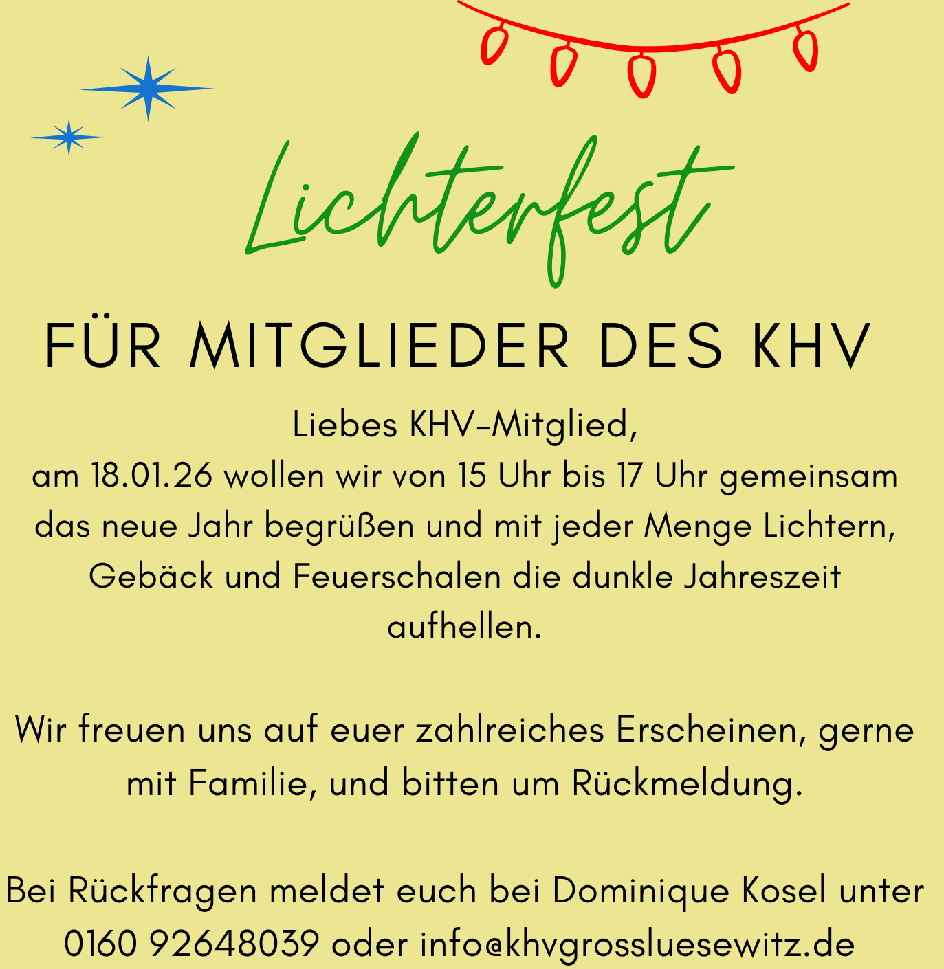 Am 18.01.2026 von 15-17 Uhr veranstalten wir ein „Lichterfest“ im Dorfgemeinschaftshaus Groß Lüsewitz, bei dem wir drinnen und draußen bei Lichterketten, Lampions und Feuerschale gesellig sein wollen. Es gibt Stockbrot und Marshmallows für die Feuerschale und Glühwein bzw. andere Heißgetränke. Im Büchereck werden wir für die Kinder eine Spiel- und Bastelecke vorbereiten. Um den Einkauf zu planen, bitten wir um Voranmeldungen. Eingeladen sind Vereinsmitglieder des KHV Groß Lüsewitz mit Familie und Freunden.