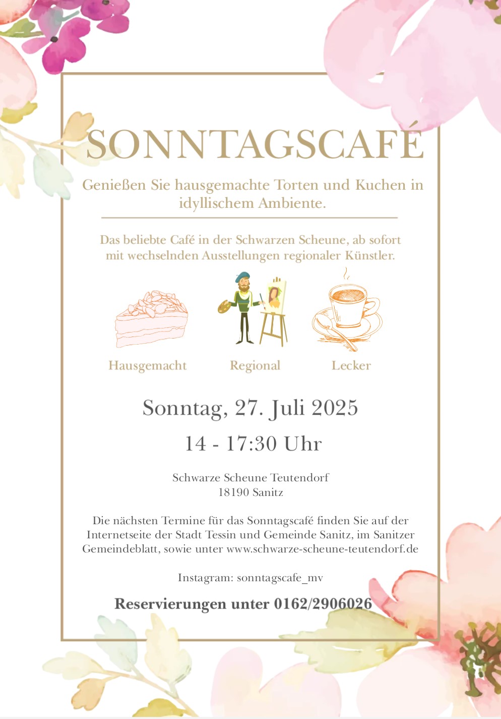 Genießen Sie hausgemachte Torten und Kuchen in idyllischem Ambiente sowie wechselnde Ausstellungen regionaler Künstler. Reservierungen unter 0162/2906026