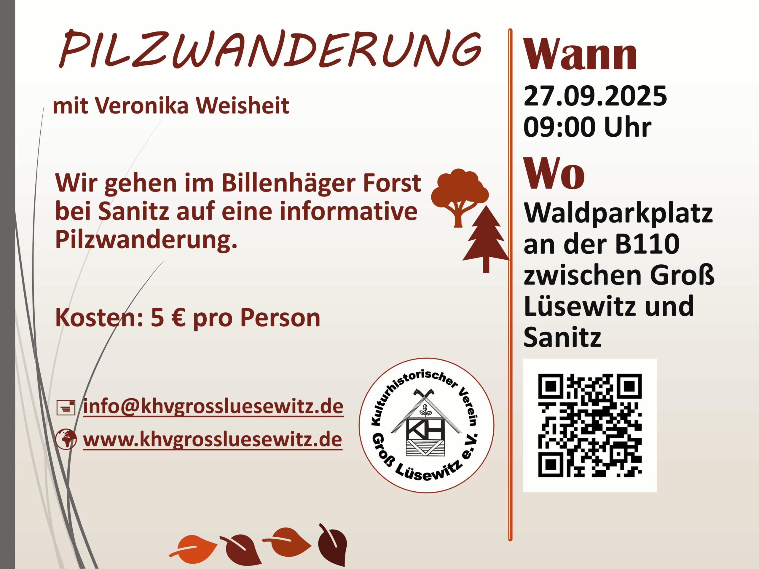 Der Kulturhistorische Verein Groß Lüsewitz e.V. geht mit allen Interessierten im Billenhäger Forst bei Sanitz auf eine informative Pilzwanderung. Kosten: 5 € pro Person. Treffpunkt ist der Waldparkplatz an der B110 zwischen Sanitz und Groß Lüsewitz.